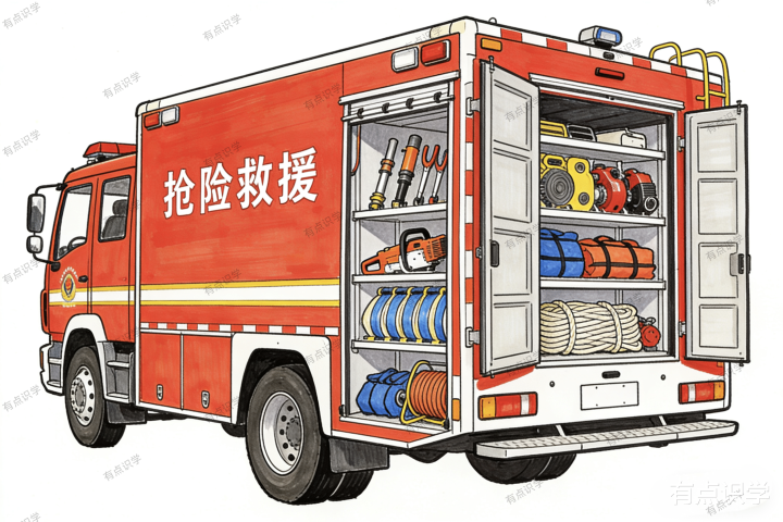 瑞士军车,啥都会点。它的主业不是灭火,而是“拆家”(救人版)。车门一开,就是个“移动工具库”。交通事故破拆、建筑坍塌支撑、高空绳索救援……各种“疑难杂症”都归它管。
