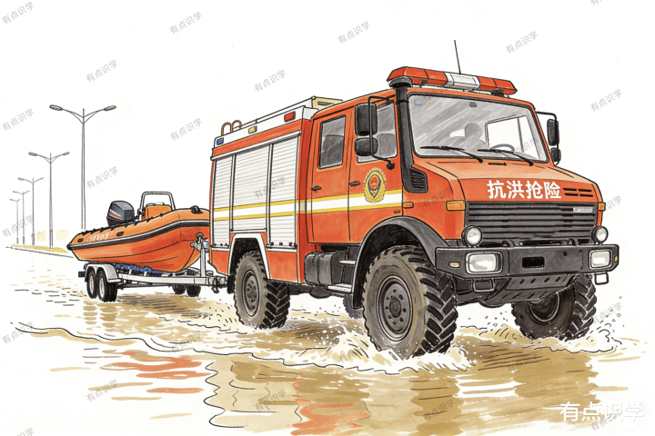 陆地巡洋舰,水上滴滴打船。专门为洪涝灾害准备的“狠角色”拥有强悍的越野和涉水能力,能拖着冲锋舟深入积水区,是洪水中的“生命摆渡车”。